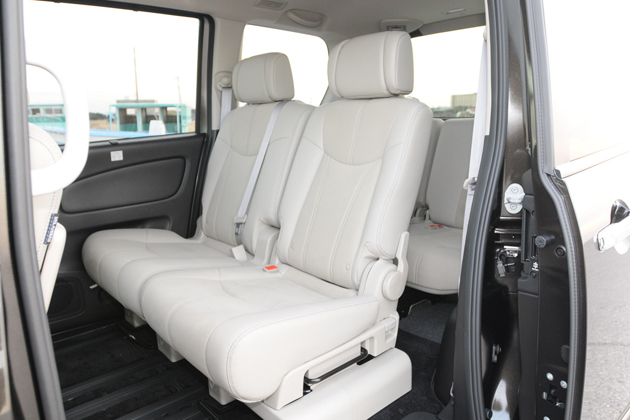 セレナのサードシートは左右跳ね上げ式スマートアップシート。[※試乗撮影車はメーカーオプションの「プレミアムハイコントラストインテリア」スエード調トリコット・カブロン内装(内装色:フェザーグレー/プレミアムパール・フィニッシャー)]