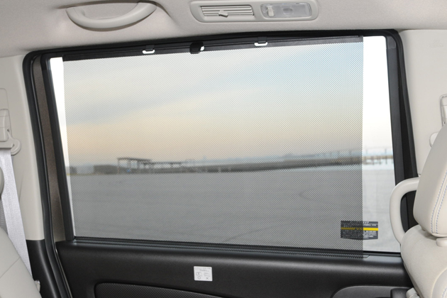 ロールサンシェードはセカンドシート左右に装備。眩しい日差しをカットしてくれる。もちろんプライバシーガラス自体にもUVカット断熱機能が備わる。[※試乗撮影車はメーカーオプションの「プレミアムハイコントラストインテリア」スエード調トリコット・カブロン内装(内装色:フェザーグレー/プレミアムパール・フィニッシャー)]