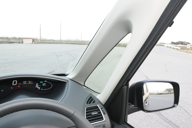 Aピラーの三角窓は運転席から死角となる部分を解消してくれる。[※試乗撮影車はメーカーオプションの「プレミアムハイコントラストインテリア」スエード調トリコット・カブロン内装(内装色:フェザーグレー/プレミアムパール・フィニッシャー)]