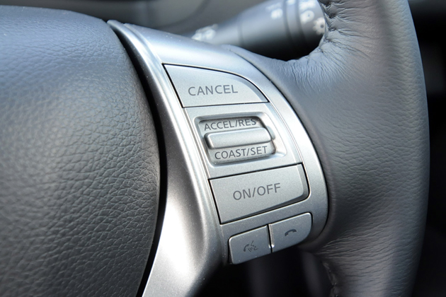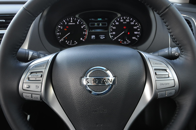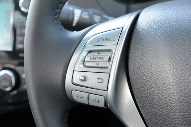 本革ステアリングホイールの左右にはナビ・オーディオ操作やクルーズコントロールなどの操作用スイッチが整然と並ぶ。
