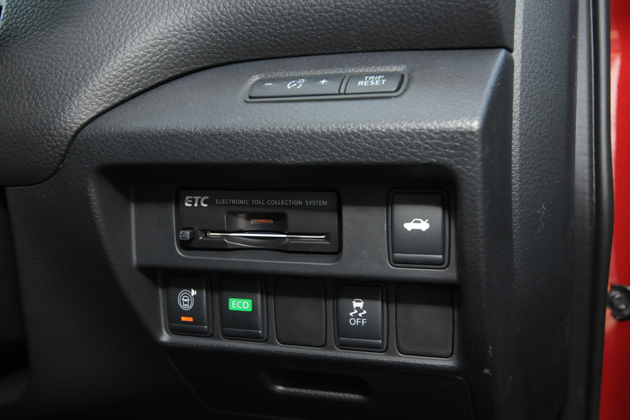 低燃費走行をサポートする「ECOモード」スイッチはインパネ右側に配置。また車線逸脱警報(LDW)や後側方車両検知警報(BSW)のキャンセルスイッチもこちらに配置する。