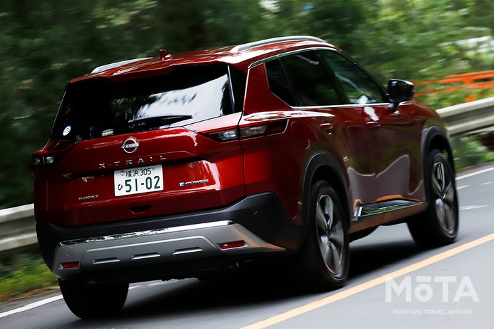 新型エクストレイルを試乗してみると、モーター駆動の特徴として、アクセルペダルを踏み増した次の瞬間には速度を素早く高めます。そのために巡航中にアクセルペダルを踏み増した時の感覚は、V型6気筒3.5Lエンジンに相当するような印象でした。