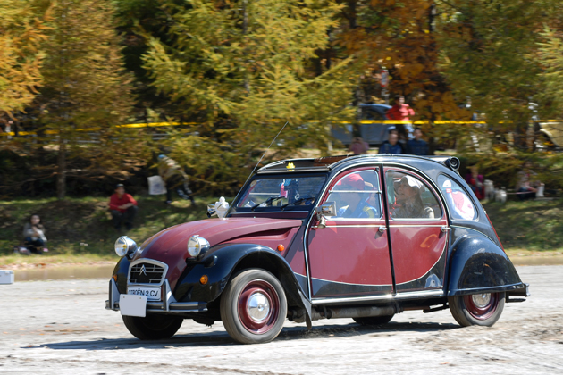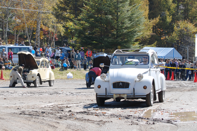 毎年、結構テクニカルなコース設定が行われるジムカーナ。今年はバックしながら水溜りに突入するコース設定。シトロエン2CVも一生懸命頑張る!