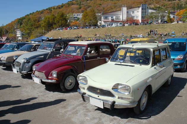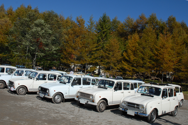 こちらは主に白や水色など淡いカラーのルノー4。前日の雨からうって変わり見事な晴天となった長野の空にも映える。