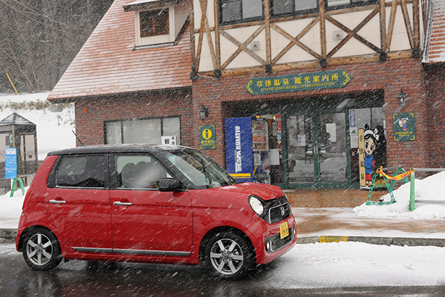 伊香保から草津までは『日本ロマンチック街道』を走ります。すると、このあたりから雪が降っていました。それも結構な量(笑)。