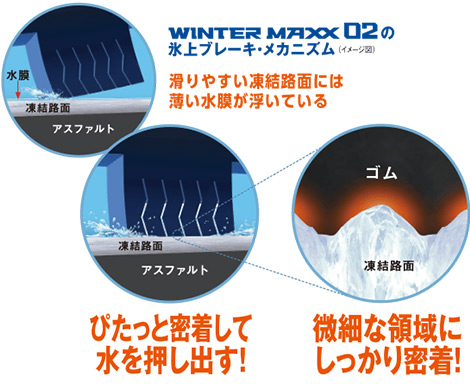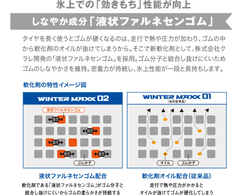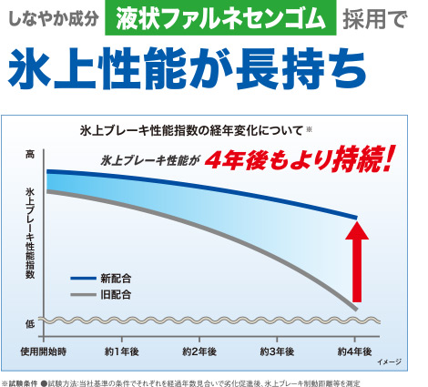 雪道を走っていていちばん怖いなぁ~と思うのは、どんな時ですか? 私は氷の上がいちばん怖いです。止まれるかなぁ? 曲がれるかなぁ? なんて具合にヒヤヒヤし通し…では、とてもじゃないけれど疲れてしまって運転できませんよね。ある程度の緊張感は無論大事ではありますが、やっぱり安心して走りたい!となると、ブレーキ性能が高い状態で長持ちする効きもち性能が高まったということは嬉しいポイントです。「買ったばかりのシーズンはすごく効いたのだけど、翌年はまったく効かなくなった~」なんてことだと、ガッカリしちゃうどころか、困りますからね。 保管状況にもよりますが、大体3シーズンがスタッドレスタイヤの寿命と言われていますが、WINTER MAXX 02に新たに加わった効きもち性能で、ゴムのしなやかさが4年後もより持続し、最後までいい効きで過ごせます。