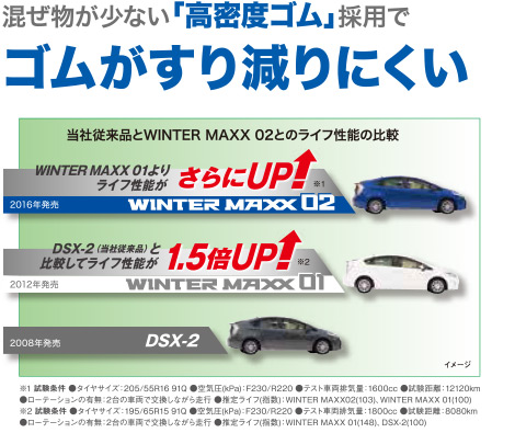※●一般的なドライバーの年間推定走行距離は10,000km(冬場のみで考えても5,000km走行)WM02の摩耗比較データから、一般的な使用であれば「4年間使える」と試算。