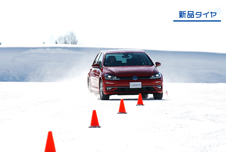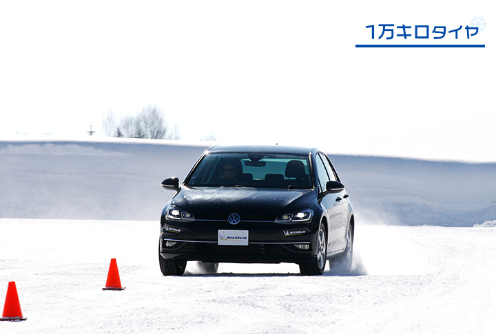 一方、1万キロ走行したタイヤは、新品よりも若干大回りをしながらパイロンを抜けていった。1万キロ走ったタイヤは、新品よりもショルダー部が減って角が丸くなっている分、”エッジ効果”による性能変化が見られた。制動距離もちょっとだが伸びた。こちらも、溝が減った分、雪を踏み固めて蹴り出す力に性能変化が見られたということだろう。