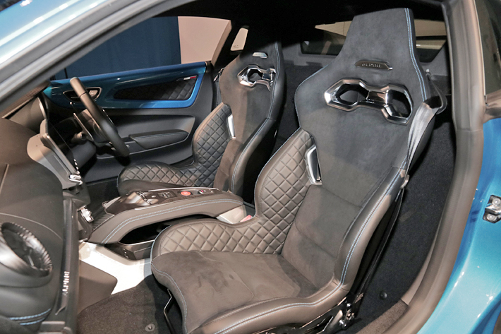 Sabelt製モノコックバケットシート(レザー/マイクロファイバー)│マットカーボン/アルミ/レザーインテリア│FOCAL製軽量4スピーカー│レザーステアリング/ブルーステアリングセンタートリム│キャリパーカラー:ブルー アルピーヌ│FUCHS製18インチ鍛造アロイホイール(シルバー)