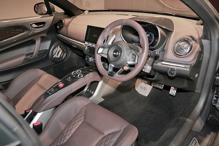 Sabelt 製スポーツシート(ブラウンレザー)│シートリフター・リクライニング│シートヒーター│ブリリアントカーボン/アルミ/レザーインテリア│FOCAL製軽量4スピーカー+サブウーファー│レザーステアリング/ブラックステアリングセンタートリム│キャリパーカラー:ブラック│18 インチアロイホイール(ブラック)