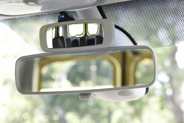 補助ミラー付のルームミラー。運転席から後席の子供の様子などをチラ見出来たりして、子育てファミリーには有効な装備だ。