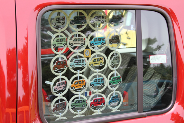 カングーユーザー手製の刺繍だ! ちゃんとフランスの刺繍メーカー製のウールを使用している。カラフルなカングーのボディカラーが再現された芸の細かい逸品![「ルノーカングージャンボリー2012」会場]
