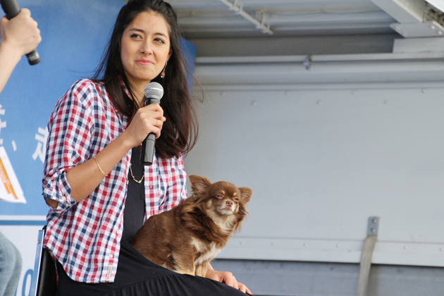 愛犬家としても知られる森 泉さん。大観衆の聴衆の中でも愛犬は動じる気配なし。それどころか、かなり眠そうな表情だ・・・。