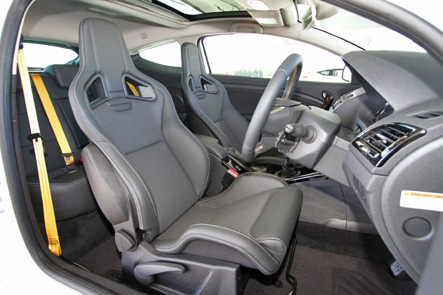 イエローのシートベルトがアクセントのインテリア。シートはレカロのバケットタイプが標準装備される。今回よりサイドサポートに人工皮革が採用された。