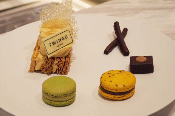 カフェ トゥインゴの特別メニューとして、トゥインゴ PH マカロンをイメージしたデザートプレートが用意されており、限定車のデザインのモチーフになった「Infiniment(アンフィニマン)」シリーズのマカロンやミルフィーユなどをセットにした贅沢なプレートが提供される(2592円)。