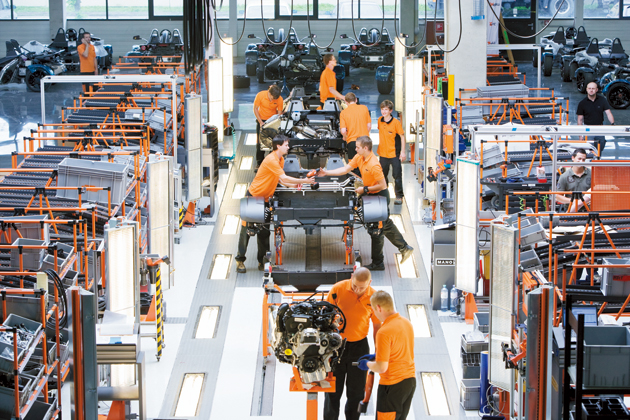 KTMのコーポレートカラーが従業員のウェアや施設内のアクセントカラーなどにも効果的に使われていて、統一感のあるキレイな工場だ。