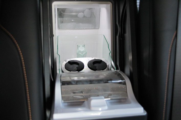 何よりも“外界”の音がほとんど入ってこず静かに保たれ、さらにカーテンなどでプライバシーを守られた室内は、まさに書斎といってふさわしい場所だった。少し疲れたら中央のアームレストを下ろし、その奥にあるふたを開けると冷蔵庫が出現。残念ながらシャンパンは入っていなかったが、飲み物を冷やしておけば、のどを潤すことも可能だ。