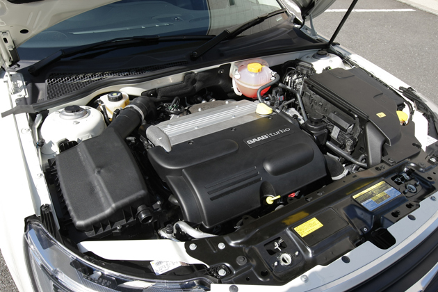 9-3には3種類のエンジンが搭載されていて、リニア用の2.0Lの低圧ターボが175ps、ヴェクター用の2.0Lの高圧ターボが209ps、エアロ用のV型6気筒2.8Lターボが255psを発生する。リニア用の低圧ターボは自然吸気エンジンにも似た滑らかな吹き上がりと燃費の良さで、高い実用性能を発揮する。