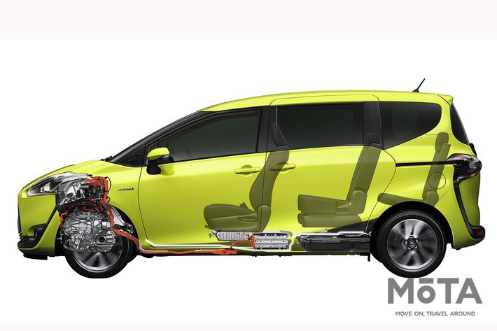 現行型シエンタのプラットフォームのベースは、ちょっと意外に思えるかもしれないが初代の「アクア」だ。もちろん車体後半部はミニバン用に最適化され、ホイールベース(前後車軸間の距離)も延伸されている。とはいえ、フロント部の低めのフォルムや傾斜の強いフロントウィンドウにベース車の名残りが感じられる。