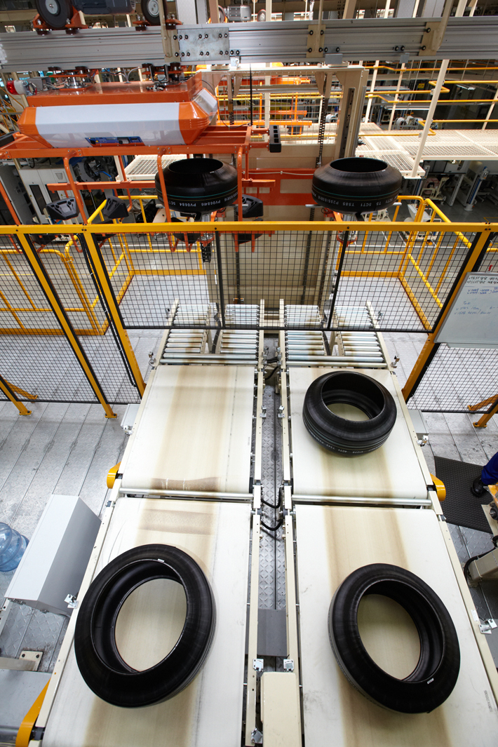 場内通路を小型運搬車両がタイヤ素材を載せて静かに徐行する。人が運転しているのではなく、カメラとモニターで待機時間、材料、運搬量、行き先を常に監視している。まるで映画「スターウォーズ」のように、トゥルーパーが遠隔管理によって一糸乱れぬ行動を強いられているかのよう。工場内は撮影禁止の為、お見せできないのが残念だ。
