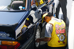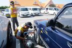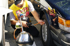 ダンロップのスタッフが2名1チームで駐車場を巡回して、オーナーに「タイヤ点検はいかがですか?」と聞いて回り、OKを出したオーナーのクルマのタイヤを1本1本ていねいにチェックしていきます。