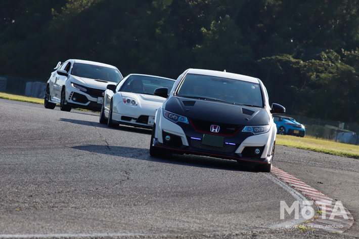 17時頃のコースイン時には日も落ちかけており、暑かった1日が嘘のように、涼しい風がサーキットに吹き始めていた。ピット出口付近で参加車を待っていると、ホームストレートの向こう、最終コーナーを超えて26台のType-Rがゆっくりと隊列を組んで走ってきた。夕暮れ迫るホンダの聖地・鈴鹿に、ホンダの象徴とも言えるType-R だけが並ぶシーンに、取材陣からも感嘆の声が漏れる。ホームストレートで2回目の記念撮影を終えると、3人の講師の先導でType-Rたちがサーキットをハイペースで目の前を駆け抜けていった。