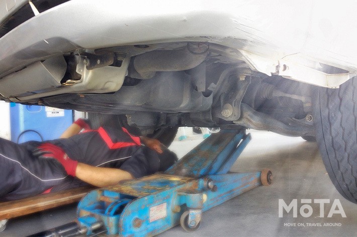 ジャッキアップした車の下に潜り込む場合は、安全確保が何よりも大切。作業は平らで頑丈な地面で行い、持ち上げた車の下にと取り外したタイヤを置いておく、そして、必ずリジットラックを使用するようにしましょう。