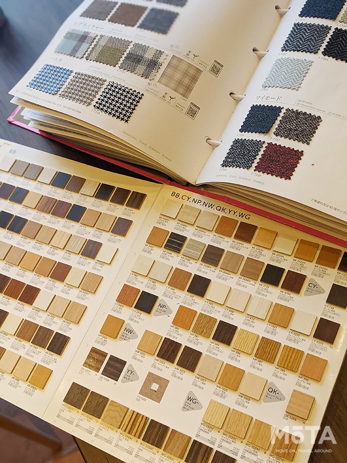 この場で見られるのは、小さな板や生地のサンプルなのでイメージが沸きにくいため、いくつかピックアップし、後日サンプルを自宅に送っていただきました。