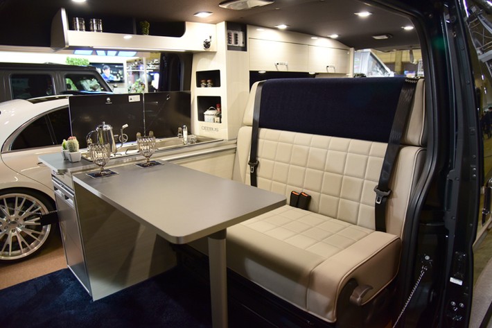 ALFLEXが展示していた「CEEBUS master’s line」は大径タイヤやフロントリップスポイラー、オーバーフェンダーなどを装備することでロー&ワイドを演出。そしてキャンピング仕様のインテリアもラグジュアリーに仕立てられている。
