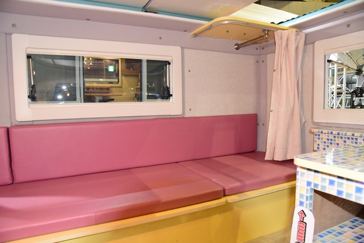 ダイレクトカーズが展示していたのは、ダイハツ ハイゼットトラックをベースにした軽キャンパー「AMAHO」。ポップな色使いのベットマット、ミニキッチン、キッチンテーブル、そして2000mm×1200mmの広々としたポップアップルーフを装備。
