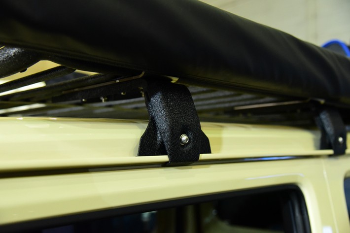 こちらのルーフラックはジムニーだけでなくデリカD:5、ハイエースに対応する豊富なサイズを展開しているという。