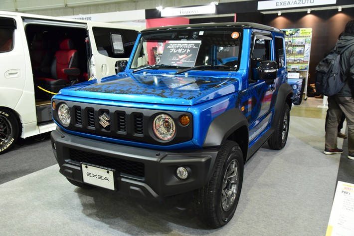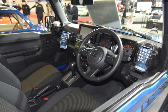 灰皿、スマホホルダーなどの商品を扱う「EXEA」のブースでは、ジムニー専用アクセサリーを装着してドレスアップされた車両を展示。
