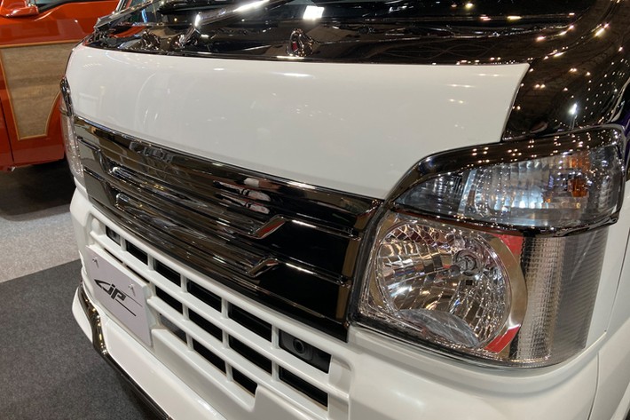 軽トラのカスタマイズパーツを展開するジェーピーのブースでは、スズキ スーパーキャリイにフロントスポイラー、衝突安全センサー対応の3分割タイプのリアバンパー、サイドステップなどのエアロパーツを装備。