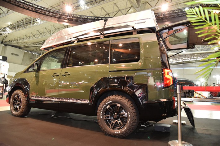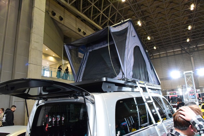 また、「メッキガーニッシュ」、「メッキテールランプ」、「メッキグリル」、「ドアミラーメッキカバー」など数々のメッキパーツを装備。どれも限定ブラッククロームメッキが施されているという。荷台に組まれたフレームの上には、ワンタッチで開いてすぐに車中泊できるルーフテントも装備。荷物もたっぷり積み込めるため、アウトドアを充実させてくれるだろう仕様となっていた。