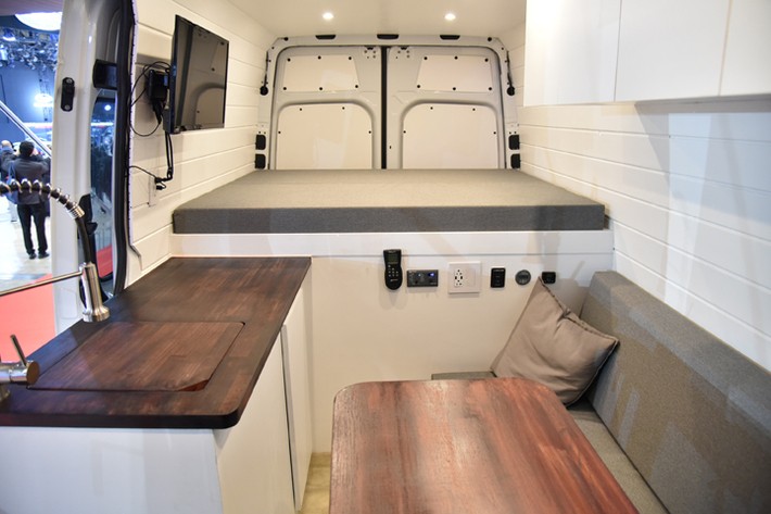 質感やルックスだけではなく、機能性も高いのがポイントだ。特に回転するフロントシートがダイネット・チェアとしての役割を担うことで、ダイネットを車両前方に寄せることができ、後方のマルチスペースを大きくとっている。このような工夫によって広々としたレイアウトを実現している。