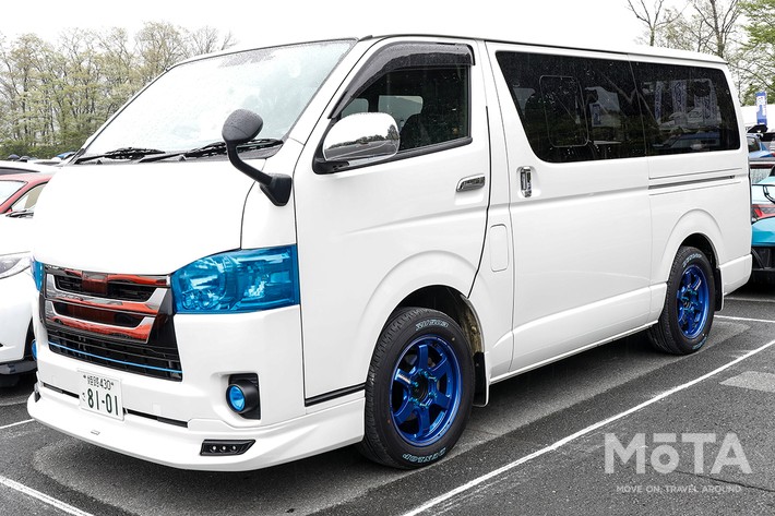 「レイズの代表作といえばTE37。商用車のハイエースにも似合うホイールです。ボディの細部に加えたブルーのアクセントに合わせてホイールもブルーにしました」