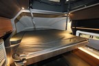 ホワイトとダークブルーでコーディネートされたインテリアは、コンロとシンクを備えた本格的なキッチンや冷蔵庫、サブバッテリーシステムなどを標準装備したフルスペック仕様。セカンドシートを展開してマットを組み合わせることで、大人2名がゆったり就寝できる長さ2400mm×幅1500mmのベッドを作れるほか、子どもや小柄な方なら横になれる横向きのリアベッドも完備しています。