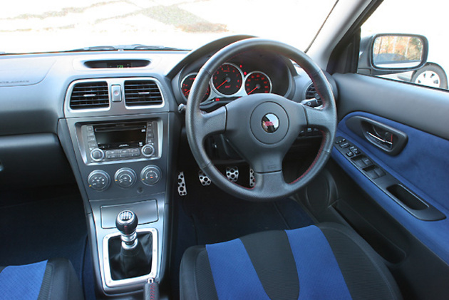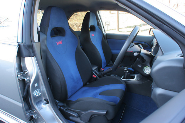インテリアではステアリング・ホイールやシフトノブに入るチェリーレッド色のステッチがSTiバージョンの証。シートも前出の16インチ仕様を除き、バケット・デザインのSTi専用アイテムが用いられる。