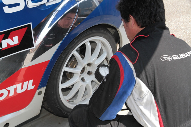 WRX STI R4 MODEL 1周するごとにタイヤの空気圧チェックを行うピットスタッフ