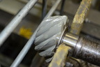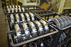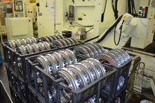 まずは、本工場内の旧中島飛行機時代から存在する建物に衝撃を受けました。なんと、太平洋戦争で活躍した「隼」や「疾風」などの戦闘機を製造していた時代の建物がそのまま残っており、今もプレス工場として稼働しているのであります。パッと見は普通の工場という感じですが、よく見ると壁が完成した飛行機を出荷するために開く巨大なトビラになっており、開閉時に使うレール部分が確認できました。当時は、ここから自走で滑走路まで移動していたそうです。