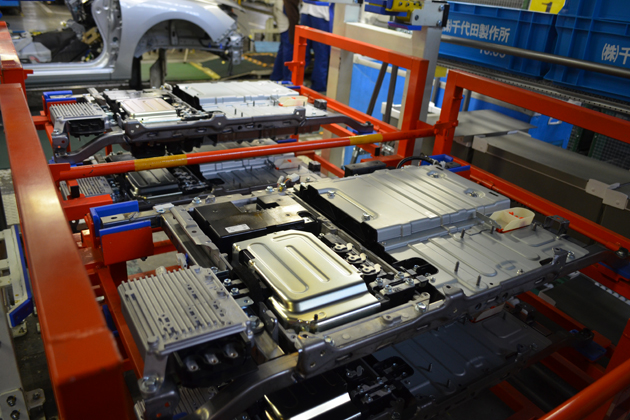 今回はXVハイブリッドにメインバッテリーが搭載される工程と、そのバッテリーから駆動モーターに電流を送る高圧電流用のケーブルが車体の裏側に配置される工程を見学しました。普通のクルマには付かない、ハイブリッドカーならではの工程ということで、特殊技能と知識を備えた専門の工員が作業します。