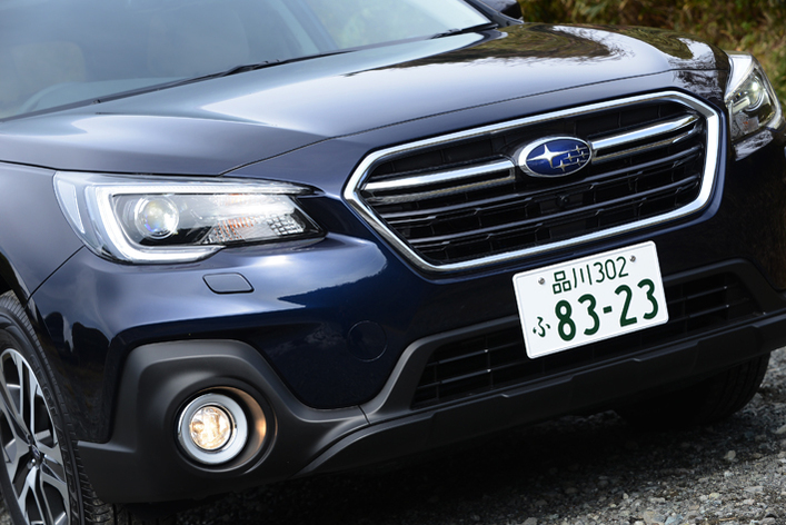 2017年9月に実施された今回の大幅改良では、エクステリアは上質さと力強さが備わったことで、アウトバックとしての個性を強めた。具体的には、フロント周りはフォグランプ周りが力強い造形に刷新されたほか、グリル内を刻むフィンをブラックアウトし、スバルのエンブレムの脇から水平に伸びるクロームメッキがヘッドランプまで繋がる視覚効果を演出。併せて、アルミホイールのデザインも一新されている。