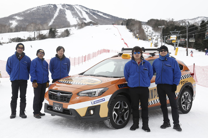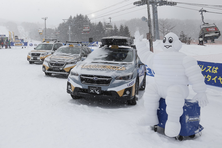 ゲレンデタクシーとして用意されていたクルマはXV/フォレスター/アウトバックのスバルSUV三兄弟。ちなみにタイヤはミシュランのスタッドレス「X-ICE3+」を履くが、それ以外は全てノーマルの状態だ。