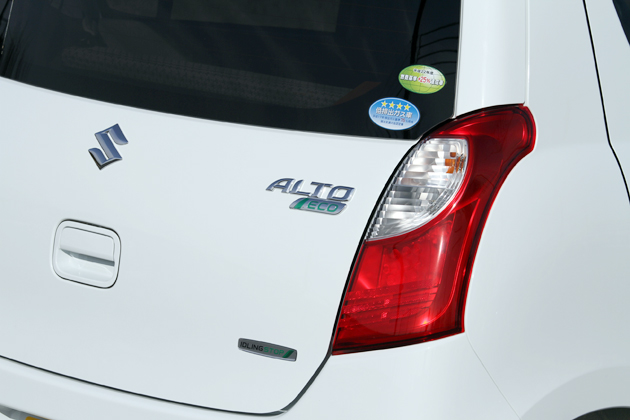 「アルト エコ」のエンブレムに加え、アイドリングストップのロゴで差別化を図られたリア周り。テールランプとハイマウントストップランプはLED化されている。