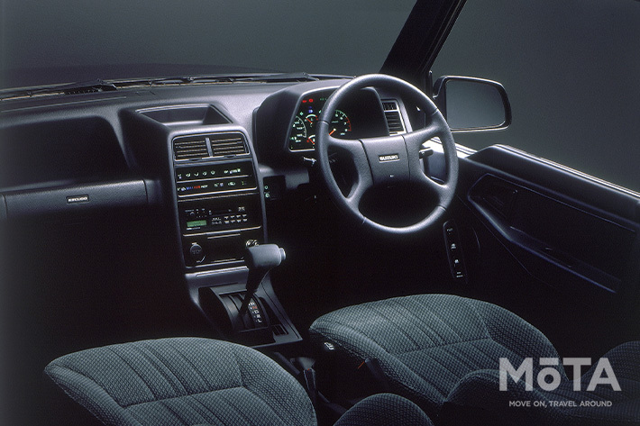 スズキ 初代エスクードは、全長3,560mm、全幅1,635mmのコンパクトなサイズに、1600ccという小排気量のエンジンを搭載。136万4000円~という低価格も大きな魅力だった。