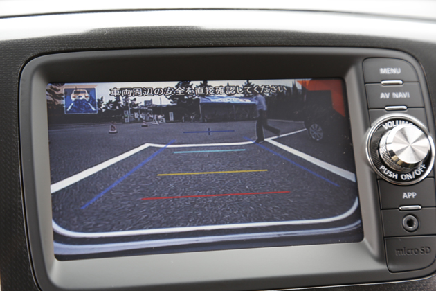 「スマートフォン連携ナビゲーション」[メーカーオプション]とセットで搭載される「後退時左右確認サポート機能」 左右から車両後方に近付いてくる車や自転車、人などを検知し、モニター内の左右確認サポート表示の点滅とブザーで、移動物の接近をドライバーに知らせてくれる。