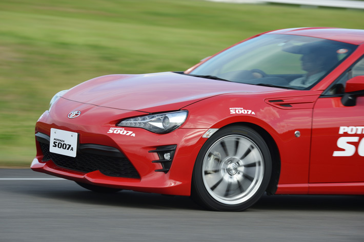 ところが新商品のS007Aに乗り替えてコースインすると、まったく別物。走りはじめから四輪のグリップ感が高いことを感じ、開発関係者からも聞いたとおり、初期応答性がよくて、ステアリングを操作したとおりにあまり遅れることなくノーズが向きを変える。S字コーナーやレーンチェンジでも挙動が乱れにくく、揺り返しがずっと小さい。