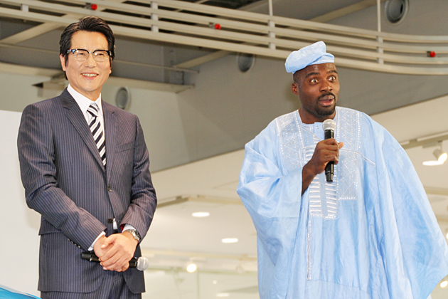 (左から)俳優の豊川悦司さん、新TVCM発表会サプライズゲストとして登場した、タレントのボビー・オロゴンさん
