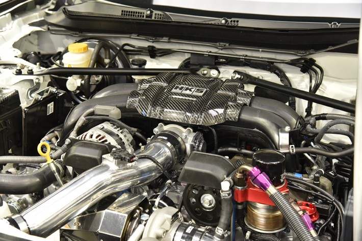 HKSブースエントランス付近に展示されたのは、ノーマルエンジンのままながら、2021年に筑波で1分1秒286を記録したタイムアタック車両のGR86。