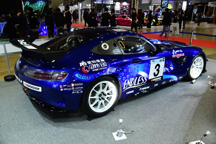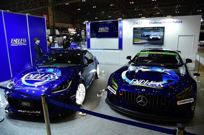 当ブースのエントランス付近に展示されていたのは、メルセデスAMG GT4とGR86。このGT4は2021年のスーパー耐久 Powered by HankookのST-Zクラスの年間チャンピオン車両だ。その横にはENDLESSの新型ブレーキキャリパーとサスペンションキットを装着したGR86のデモカーも展示されていた。